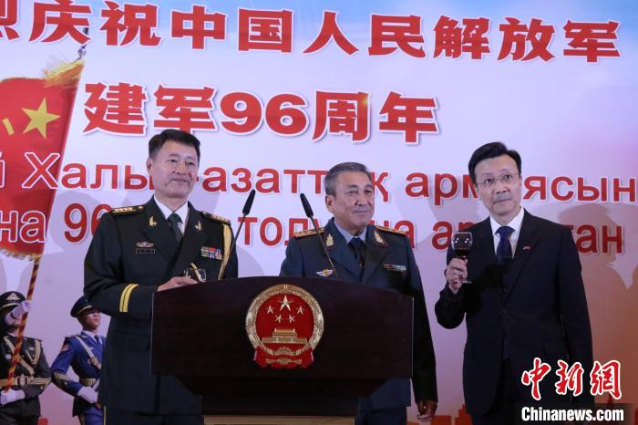 當地時間7月28日晚,哈薩克斯坦阿斯塔納,中國駐哈薩克斯坦大使館隆重舉(ju) 行慶祝中國人民解放軍(jun) 建軍(jun) 96周年招待會(hui) 。圖中從(cong) 左至右依次為(wei) :國防武官胡德君大校、哈國防部副部長卡馬列特季諾夫中將、駐哈大使張霄。 中新網記者 張碩 攝