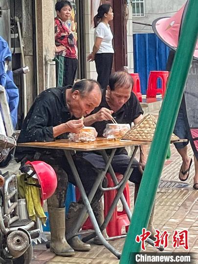 村中,七旬的吳大爺和數名年齡相近的村民,已自發幫助清理村中街道長達11個(ge) 小時。17時許,吳大爺在街邊攤位吃著麵條,稍作歇息後,他將重新投入清理工作。