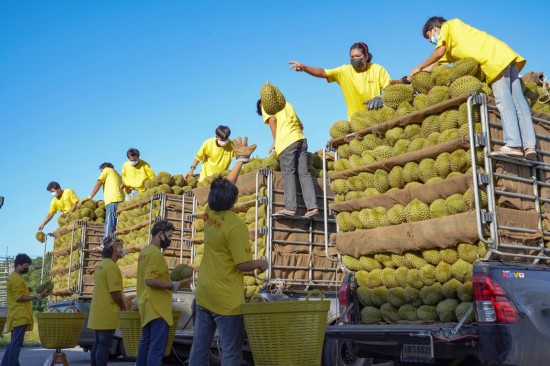 2021年5月30日,在重慶洪九果品股份有限公司位於(yu) 泰國尖竹汶府的工廠內(nei) ,工作人員在裝運即將銷往中國的榴蓮。新華社發