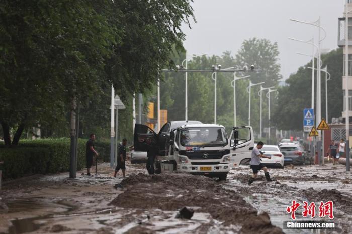 8月1日,北京市門頭溝區橋東(dong) 街,救援車輛拉走受損汽車。 中新社記者 盛佳鵬 攝