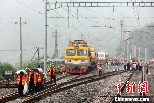 8月1日,北京門頭溝區,豐(feng) 沙鐵路妙峰山鎮水峪嘴村段,工作人員前往鐵路線清淤搶修。7月29日以來,北京地區持續強降雨,西南部降雨量大。受降雨影響,北京豐(feng) 台至沙城鐵路(豐(feng) 沙線)嚴(yan) 重水害。 中新社記者 盛佳鵬 攝