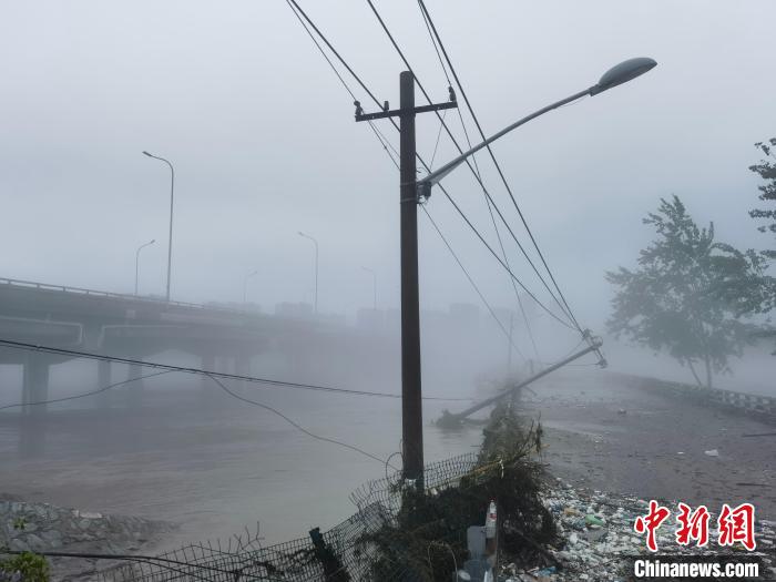 8月1日下午,在永定河京原漫水橋現場,武警北京總隊機動第三支隊200名官兵正在此處實施封堵作業(ye) ,以防止洪水漫溢,影響周邊百姓。圖為(wei) 京原漫水橋上的一根電線杆已被洪流衝(chong) 歪,各種雜物散落各處。中新社記者 劉亮 攝