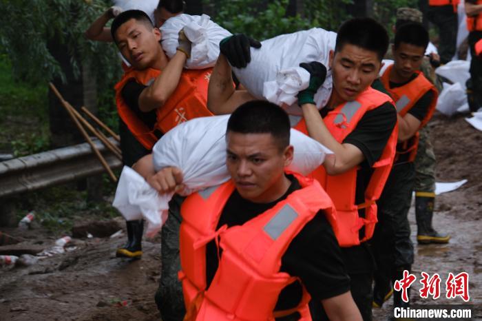 8月1日下午,在永定河京原漫水橋現場,武警北京總隊機動第三支隊200名官兵正在此處實施封堵作業(ye) ,以防止洪水漫溢,影響周邊百姓。圖為(wei) 武警官兵修築堤壩。中新社記者 李太源 攝