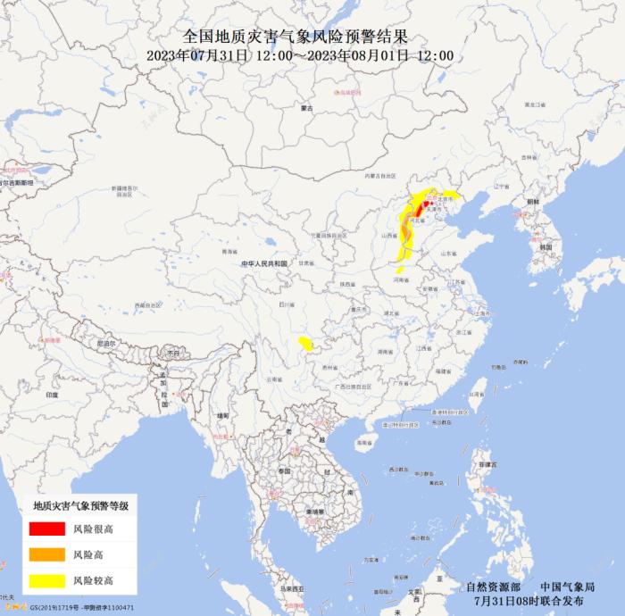 7月31日12時至8月1日12時,北京西部和北部、天津北部局部、河北西部和東(dong) 北局部、山西東(dong) 部、河南北部局部、四川東(dong) 南局部、雲(yun) 南東(dong) 北局部發生地質災害的風險較高(黃色預警);