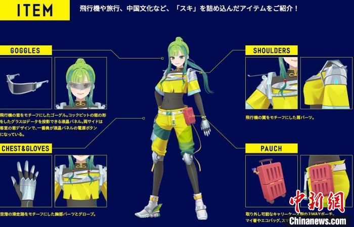 她的頭發和眼睛是綠色的,因為(wei) 綠色是公司的代表色。此外,她身上有許多航空元素,護目鏡采用了飛機前窗的樣式,胸口和手套的原型是飛機的滑行道,肩膀上參考了機翼的設計,腰間還掛著一個(ge) 行李箱樣式的小包。