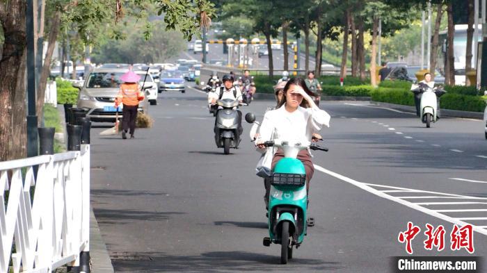 圖為(wei) 一位女士騎電動車時用手遮擋陽光。王偉(wei) 臣 攝