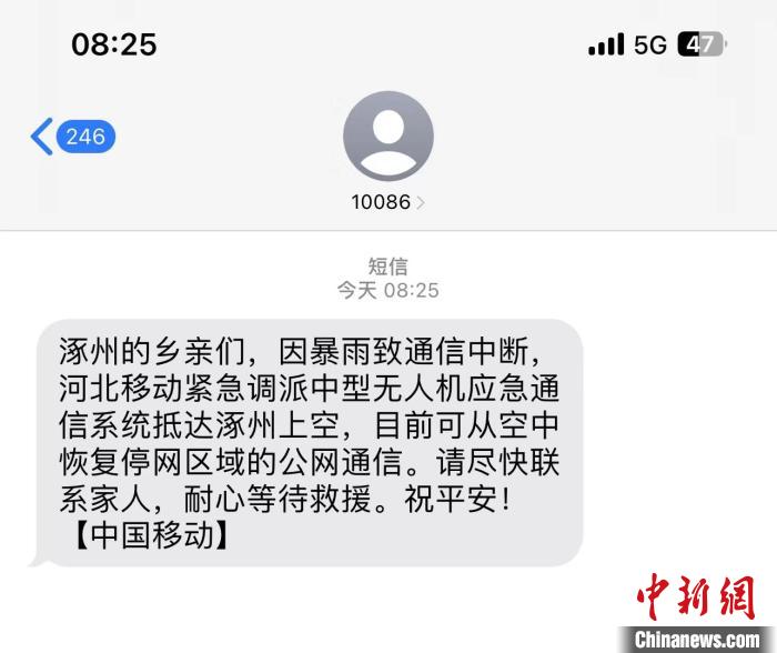 中新網石家莊8月3日電 (郝燁 趙景科)“【中國移動】涿州的鄉(xiang) 親(qin) 們(men) ,因暴雨致通信中斷,河北移動緊急調派中型無人機應急通信係統抵達涿州上空,目前可從(cong) 空中恢複停網區域的公網通信。請盡快聯係家人,耐心等待救援。祝平安!”8月3日早,河北涿州災區的群眾(zhong) 收到一條來自空中的短信。