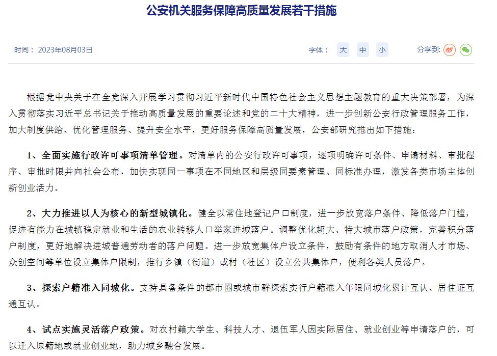 8月3日,公安部發布公安機關(guan) 服務保障高質量發展若幹措施,其中在戶籍政策方麵提出一係列舉(ju) 措。