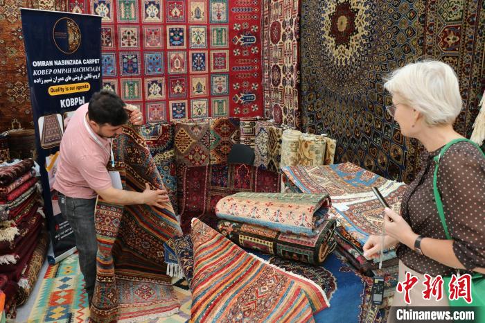 當地時間8月3日,哈薩克斯坦阿斯塔納,阿富汗商品展當日啟幕。圖為(wei) 展商向哈顧客展示富有阿民族風情的手工羊毛地毯。 中新網記者 張碩 攝