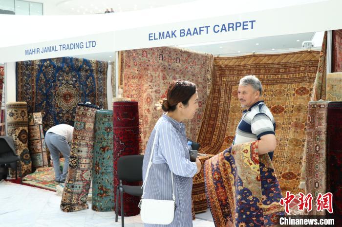 當地時間8月3日,哈薩克斯坦阿斯塔納,阿富汗商品展當日啟幕。圖為(wei) 展商向哈顧客展示阿富汗手工羊毛地毯。 中新網記者 張碩 攝