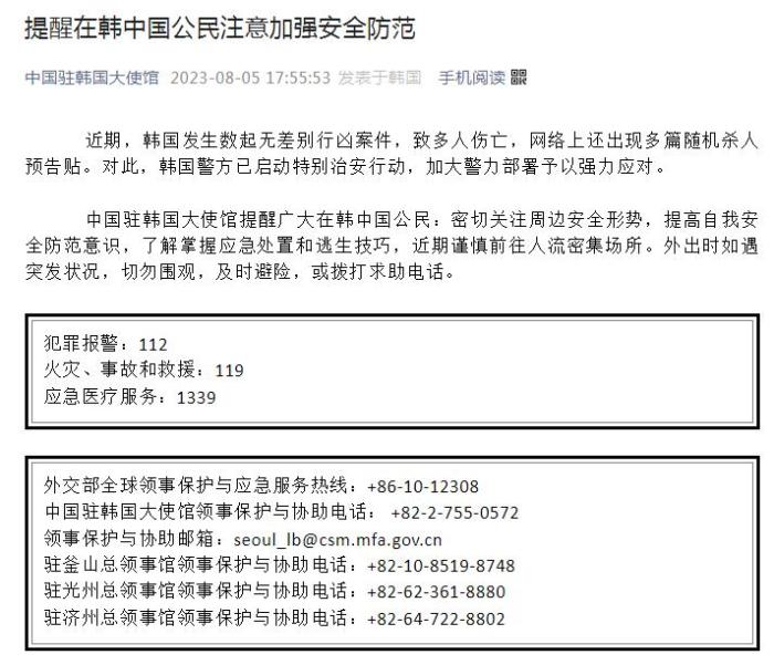 中新網8月5日電 據中國駐韓國大使館微信公眾(zhong) 號5日消息,近期,韓國發生數起無差別行凶案件,致多人傷(shang) 亡,網絡上還出現多篇隨機殺人預告貼。對此,韓國警方已啟動特別治安行動,加大警力部署予以強力應對。