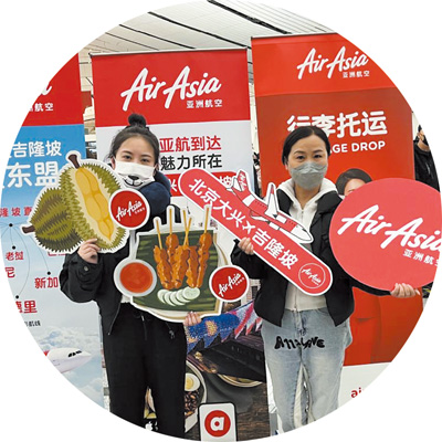 在馬來西亞(ya) 吉隆坡國際機場,工作人員歡迎中國遊客。