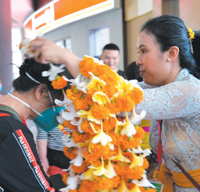 在印度尼西亞(ya) 巴厘島伍拉萊國際機場,工作人員為(wei) 中國遊客佩戴迎賓花環。