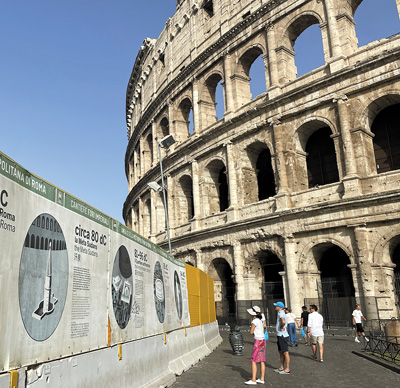在意大利羅馬熱門景點鬥獸(shou) 場,遊客正在閱讀帶有中文解說的標識牌。