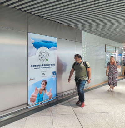 希臘雅典國際機場內(nei) ,旅客走過用中文書(shu) 寫(xie) 的廣告海報。