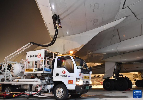 8月1日,在中國鄭州新鄭國際機場,中國航油華南藍天河南分公司的工作人員為(wei) 一架盧森堡貨航貨機加油。新華社記者 李嘉南 攝