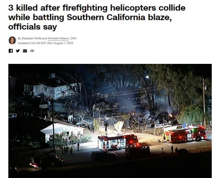 中新網8月7日電 綜合美媒報道,美國消防官員表示,當地時間8月6日,一架被派往加州撲滅野火的消防直升機與(yu) 另一架消防直升機相撞,造成3人死亡。