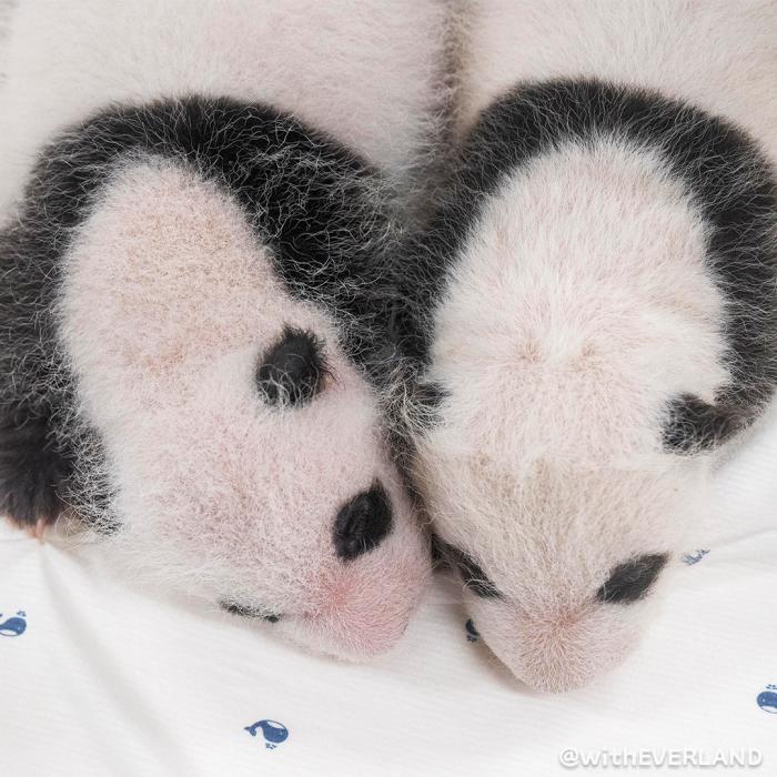 據報道,從(cong) 公開的照片來看,這對大熊貓寶寶已開始慢慢長胖,眼睛、耳朵、肩膀、胳膊、腿周圍,顯現出獨特的黑色斑紋。