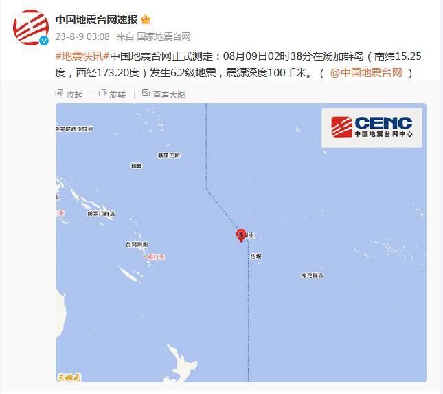中國地震台網正式測定:08月09日02時38分在湯加群島(南緯15.25度,西經173.20度)發生6.2級地震,震源深度100千米。(國家地震台網官方微博)
