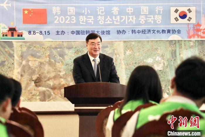 8日,“2023韓國小記者中國行”活動在首爾舉(ju) 行啟程儀(yi) 式。圖為(wei) 中國駐韓國大使邢海明致辭。中國駐韓國大使館供圖