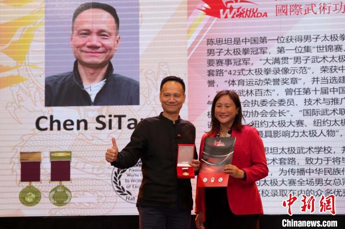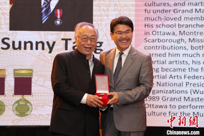 7日,國際武術聯合會(hui) 執行委員、加拿大武術團體(ti) 聯合總會(hui) 會(hui) 長鄧華(左)獲頒國際武術功夫名人堂勳章。中新社記者 餘(yu) 瑞冬 攝