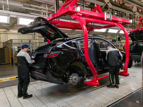 在特斯拉上海超級工廠,工人在車間內(nei) 忙碌(2月27日攝)。新華社記者 周蕊 攝