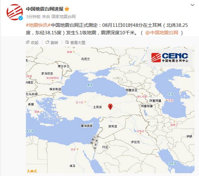 中新網8月11日電 據國家地震台網官方微博消息,中國地震台網正式測定:8月11日01時48分在土耳其(北緯38.25度,東(dong) 經38.15度)發生5.1級地震,震源深度10千米。