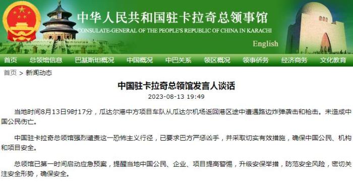 中國駐卡拉奇總領館強烈譴責這一恐怖主義(yi) 行徑,已要求巴方嚴(yan) 懲凶手,並采取切實有效措施,確保中國公民、機構和項目安全。