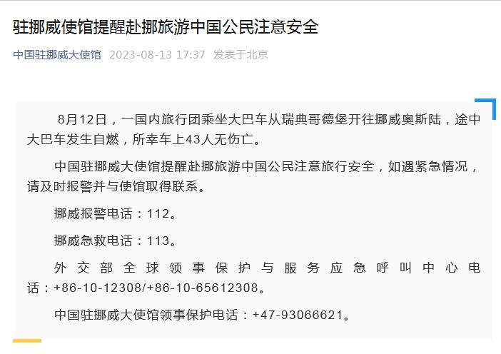 中新網8月13日電 據中國駐挪威大使館微信公眾(zhong) 號消息,8月12日,一國內(nei) 旅行團乘坐大巴車從(cong) 瑞典哥德堡開往挪威奧斯陸,途中大巴車發生自燃,所幸車上43人無傷(shang) 亡。