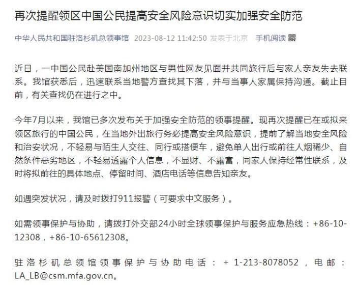 中新網8月12日電 據中國駐洛杉磯總領事館官方公眾(zhong) 號12日消息,近日,一中國公民赴美國南加州地區與(yu) 男性網友見麵並共同旅行後與(yu) 家人親(qin) 友失去聯係。中國駐洛杉磯總領事館獲悉後,迅速聯係當地警方查找其下落,並與(yu) 當事人家屬保持溝通。截至目前,有關(guan) 查找仍在進行之中。