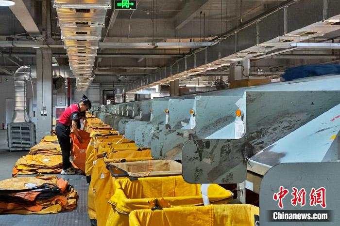 員工在圓通速遞分揀中心辛勤工作。中新財經 葛成 攝