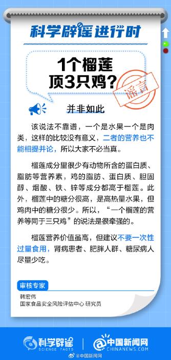 中新網8月15日電 1個(ge) 榴蓮頂3隻雞?該說法不靠譜,一個(ge) 是水果一個(ge) 是肉類,這樣的比較沒有意義(yi) ,二者的營養(yang) 也不能相提並論。雖然榴蓮營養(yang) 價(jia) 值高,但還是建議不要一次性過量食用,腎病患者、肥胖人群、糖尿病人盡量少吃。(來源:@科學辟謠 @中國新聞網 )