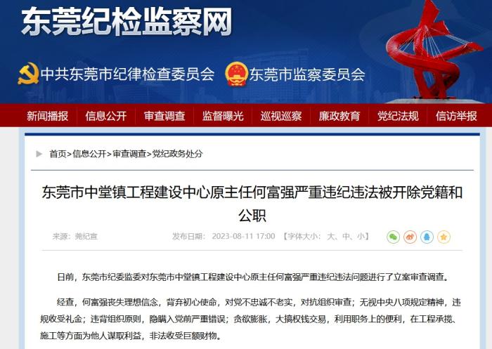 中新網北京8月14日電 近日,廣東(dong) 東(dong) 莞市紀委監委發布消息,東(dong) 莞市中堂鎮工程建設中心原主任何富強被“雙開”。