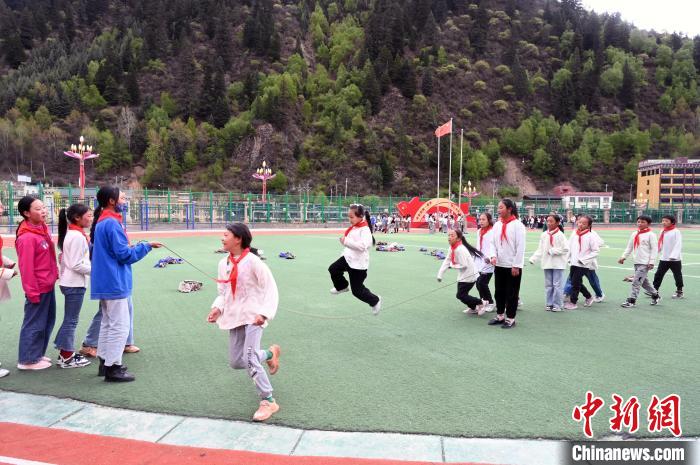 5月17日,四川阿壩州壤塘縣寄宿製學校的學生在操場跳繩。 中新社記者 安源 攝