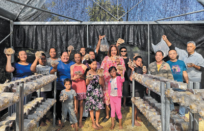 湯加示範戶阿拉尼一家在中國援助的食用菌大棚裏采摘豐(feng) 收的食用菌。