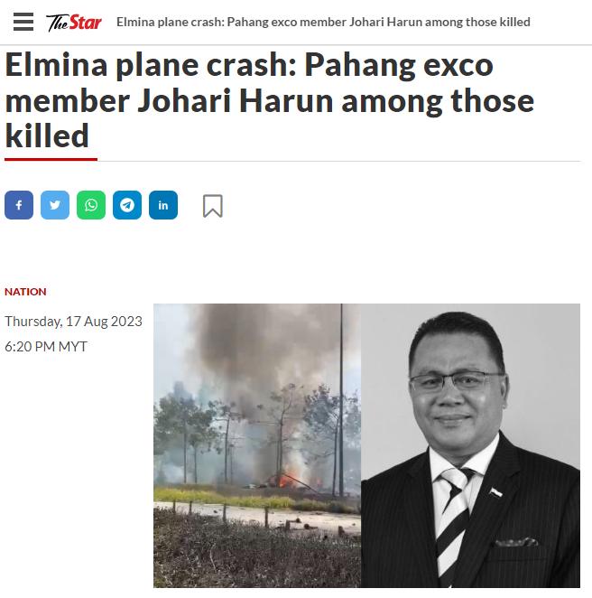 據此前報道,當地時間17日下午,一架小型飛機墜落在雪蘭(lan) 莪州首府莎阿南市的公路上,造成機上8名人員,以及地麵上一名摩托車手和一名汽車司機死亡。