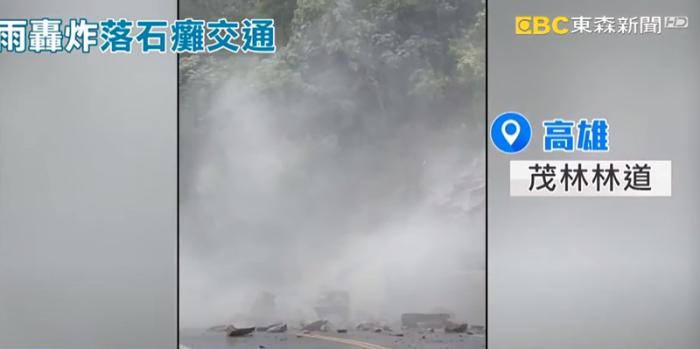 圖為(wei) 台灣高雄市遭落石的山路。 圖片來源:台灣東(dong) 森新聞網視頻截圖