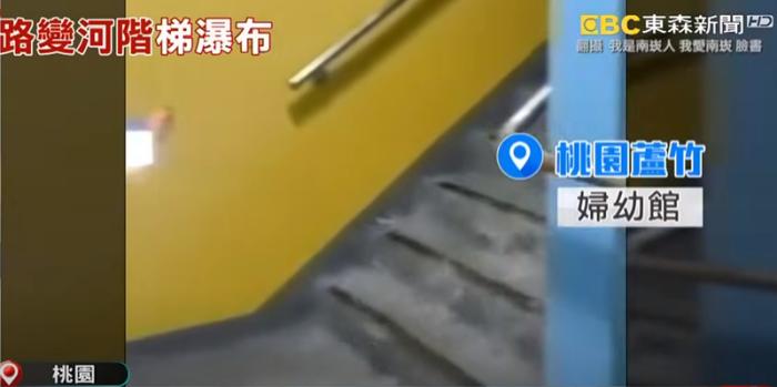 圖為(wei) 台灣桃園市蘆竹區婦女館的樓梯出現“小瀑布”。 圖片來源:台灣東(dong) 森新聞網視頻截圖