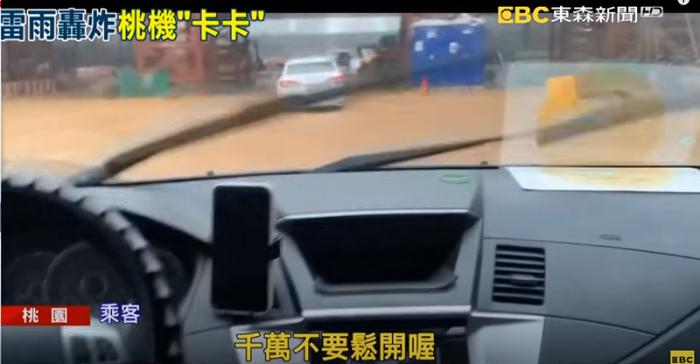 圖為(wei) 台灣桃園機場乘客涉水開車通過積水路麵。圖片來源:台灣東(dong) 森新聞網視頻截圖