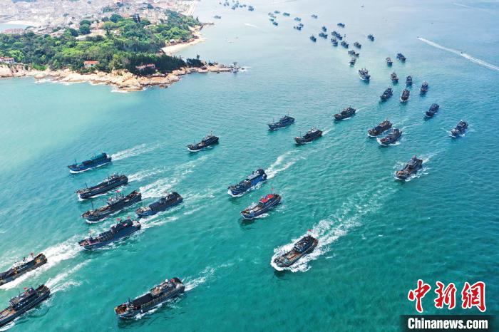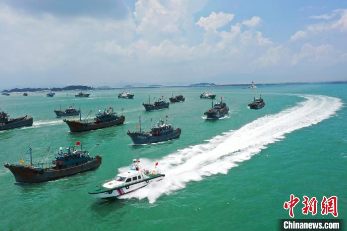 中新網漳州8月16日電(蔡曉曄)16日12時起,北緯26度30分以南的東(dong) 海結束為(wei) 期3個(ge) 半月的伏季休漁期,在福建省漳州市各碼頭,眾(zhong) 多漁船在海警艦艇的護航下有序駛離漁港,千帆競發奔赴不同漁區開展捕撈作業(ye) 。