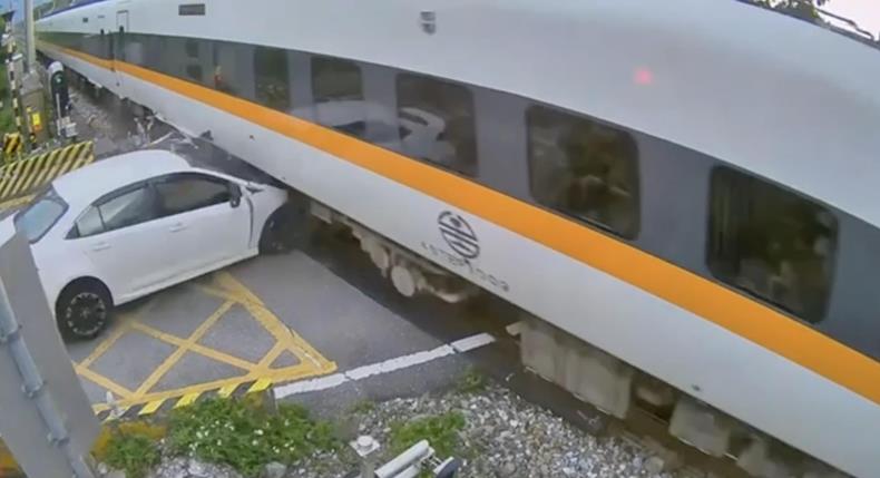 白色轎車直衝(chong) 行進間太魯閣列車,造成列車與(yu) 轎車毀損。 圖片來源:台灣《聯合報》