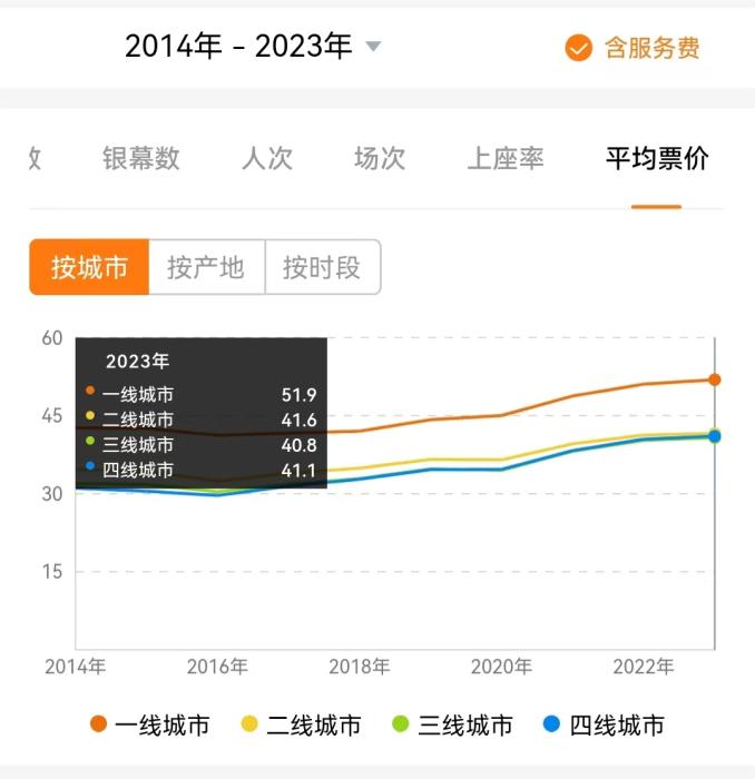 另外,相較二三四線城市,一線城市票價(jia) 明顯較貴。繼2022年衝(chong) 上50元大關(guan) 後,2023年,一線城市平均票價(jia) 達到51.9元,二三四線城市近兩(liang) 年則漲至40元以上。