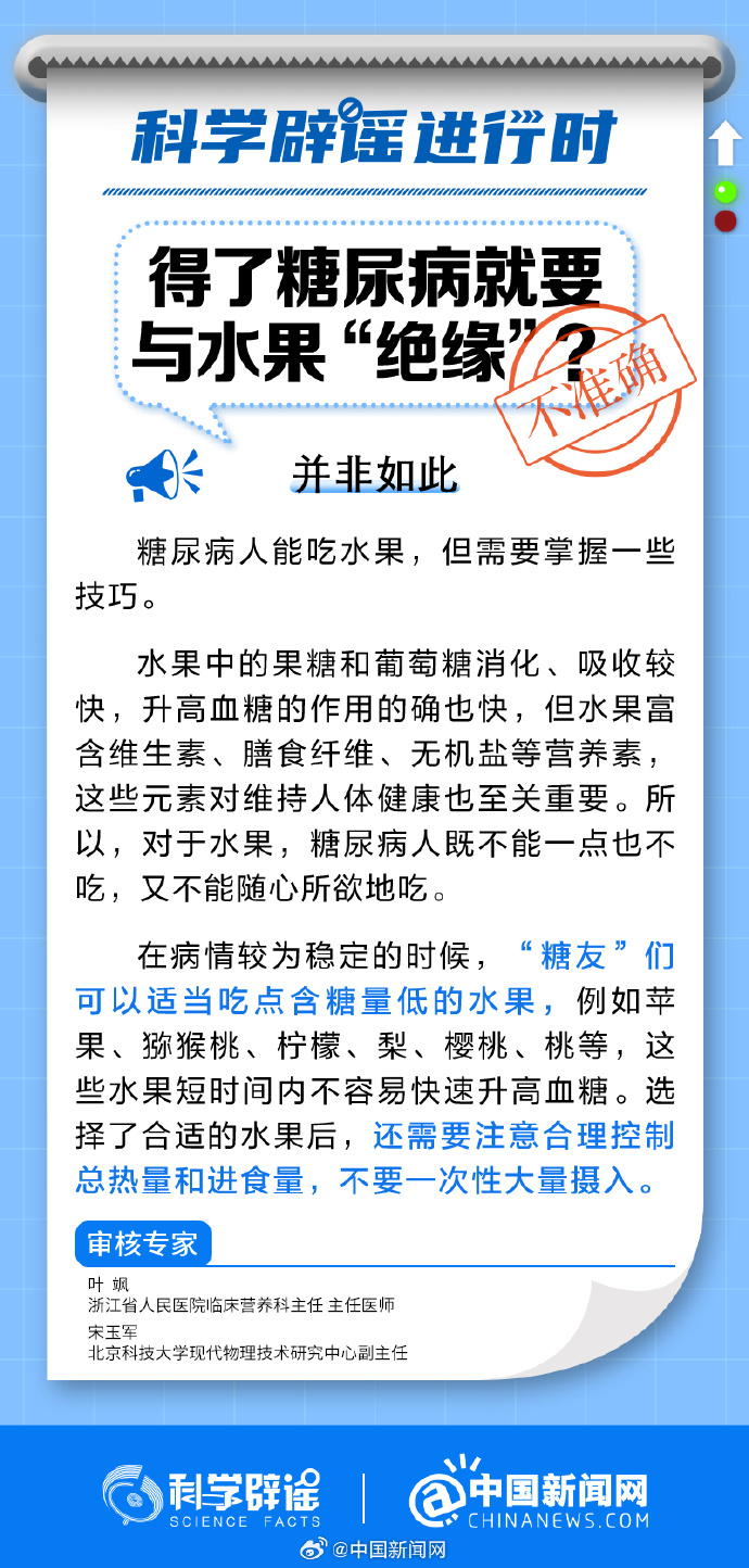 中新網8月21日電 在病情較為(wei) 穩定的時候,“糖友”們(men) 可以適當吃點含糖量低的水果,例如蘋果、獼猴桃、檸檬、梨、櫻桃、桃等,這些水果短時間內(nei) 不容易快速升高血糖。選擇了合適的水果後,還需要注意合理控製總熱量和進食量,不要一次性大量攝入。(來源:@科學辟謠 @中國新聞網 )