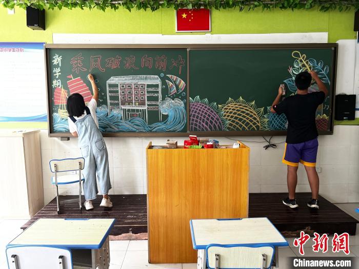 在一間教室裏,來自夏村中學的教師丁玲正帶著學生徐俊熙繪製迎接新生的黑板報,有大船、海浪、向日葵等圖案。徐俊熙開學上初二,他對記者說:“這個(ge) 黑板報的主題‘乘風破浪向前衝(chong) ’,是為(wei) 了激勵同學們(men) 要堅強起來,不畏困難,積極向上。”