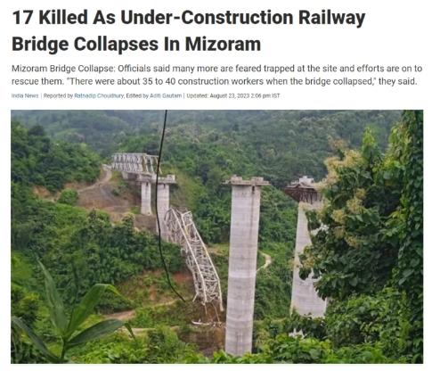 中新網8月23日電 據印度電視台報道,當地時間23日,印度警方稱,米佐拉姆邦塞朗地區附近一座正在施工的鐵路橋倒塌,造成至少17名工人遇難。