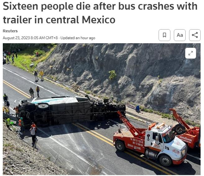 中新網8月23日電 據美國有線電視新聞網(CNN)報道,當地時間22日淩晨,墨西哥普埃布拉州發生一起交通事故,一輛大巴車和一輛拖車相撞,導致至少16人遇難,另有36人受傷(shang) 。