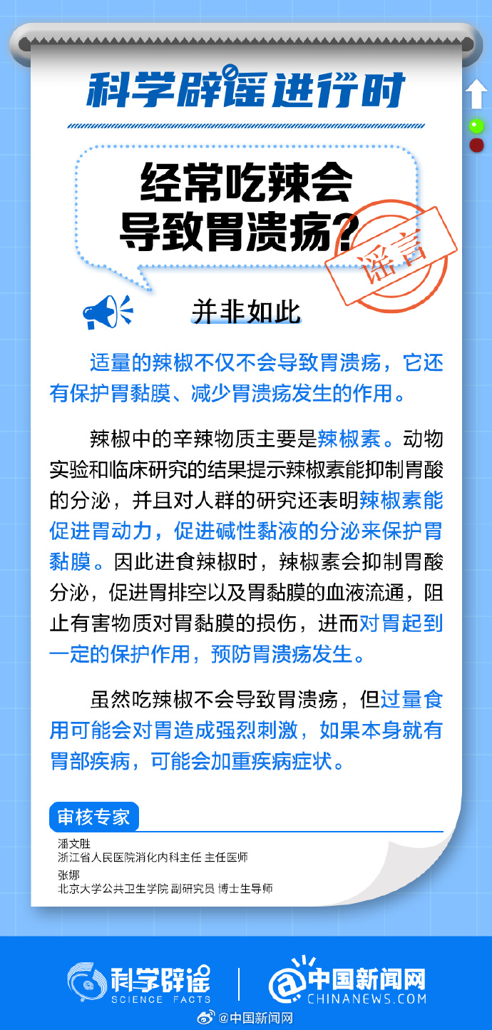 中新網8月23日電 適量的辣椒不僅(jin) 不會(hui) 導致胃潰瘍,它還有保護胃黏膜、減少胃潰瘍發生的作用。辣椒中的辣椒素會(hui) 抑製胃酸分泌,促進胃排空以及胃黏膜的血液流通,阻止有害物質對胃黏膜的損傷(shang) ,進而對胃起到一定的保護作用,預防胃潰瘍發生。但過量食用辣椒可能會(hui) 對胃造成強烈刺激,如果本身就有胃部疾病,可能會(hui) 加重疾病症狀。(來源:@科學辟謠 @中國新聞網 )