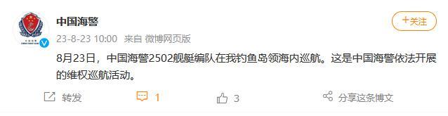 中新網8月23日電 據中國海警局官方微博消息,8月23日,中國海警2502艦艇編隊在中國釣魚島領海內(nei) 巡航。這是中國海警依法開展的維權巡航活動。
