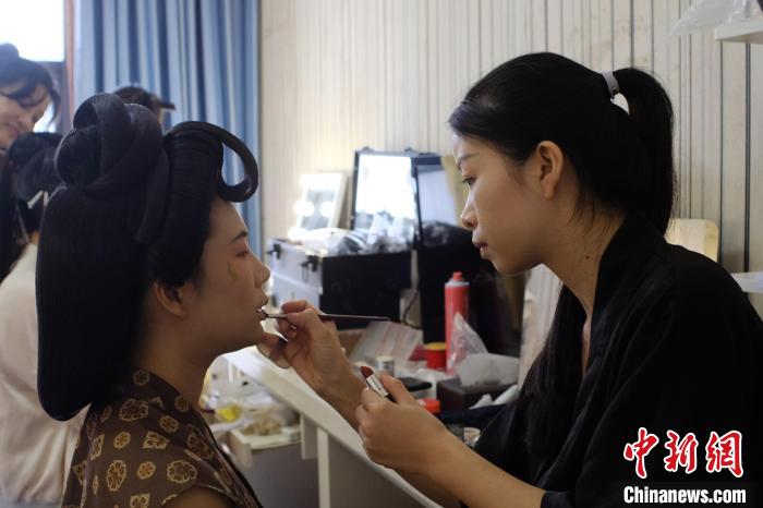 8月20日,廣西柳州,古典妝造師覃麗(li) 華正忙著給選手們(men) 化妝,完成整套造型需花費數小時。中新社記者 劉俊聰 攝
