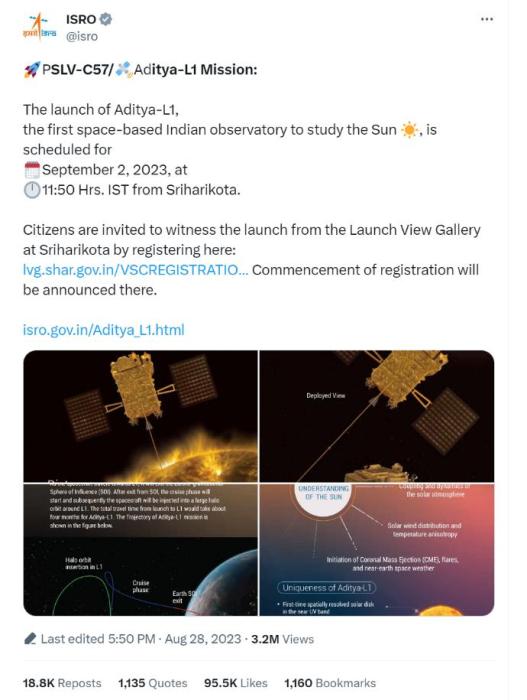 據介紹,“太陽神-L1號”將於(yu) 印度標準時間11時50分發射升空,飛行裏程約為(wei) 150萬(wan) 公裏。印度空間研究組織預計“太陽神-L1號”將花費4個(ge) 月時間抵達拉格朗日L1點,隨後將開始其觀測任務。